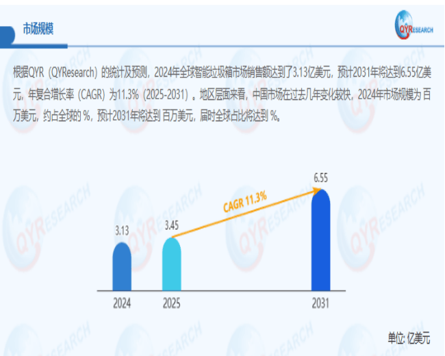 按照QYResearch最新发布的《2026-2032全球取中国智能垃圾箱市场现状及将来成长趋向》市场研究演讲显示,全球智能垃圾箱市场规模估计将从2024年的约3。13亿美元稳步增加至2025年的3。45亿美元,正在预测期内以11。3%的复合年增加率(CAGR)持续扩张,到2031年无望达到6。55亿美元。